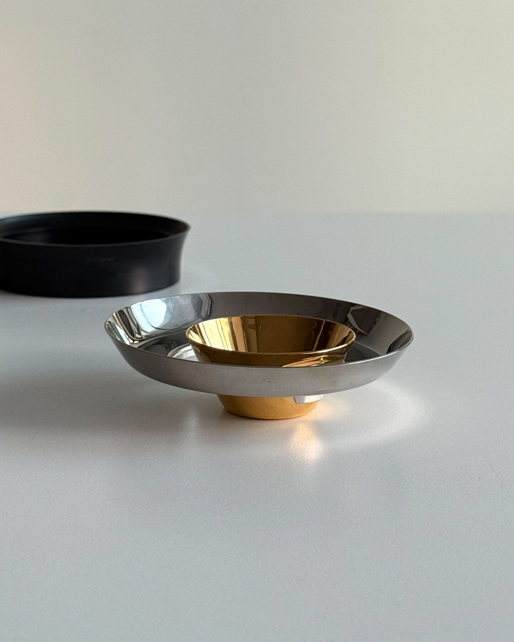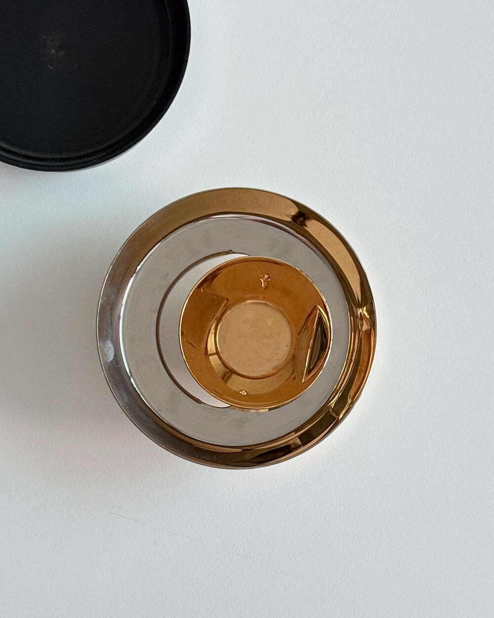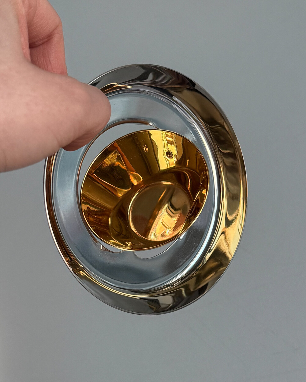 1970년대 독일 GRASOLI 사에서 생산된 위스키 및 칵테일 계량 바웨어입니다. 잔 위에 올려 사용하는 구조로, 가운데 계량컵에 술을 따르면 정해진 양이 차는 순간 컵이 기울며 자동으로 잔에 따라집니다. 별도의 계량 없이도 일정한 용량을 손쉽게 맞출 수 있습니다. 스테인리스 바디와 골드 톤의 계량컵이 대비를 이루는 깔끔한 디자인입니다.