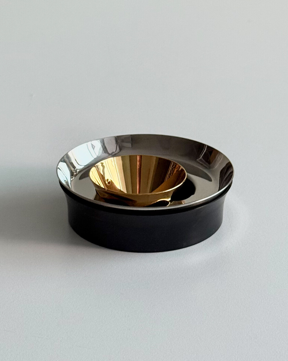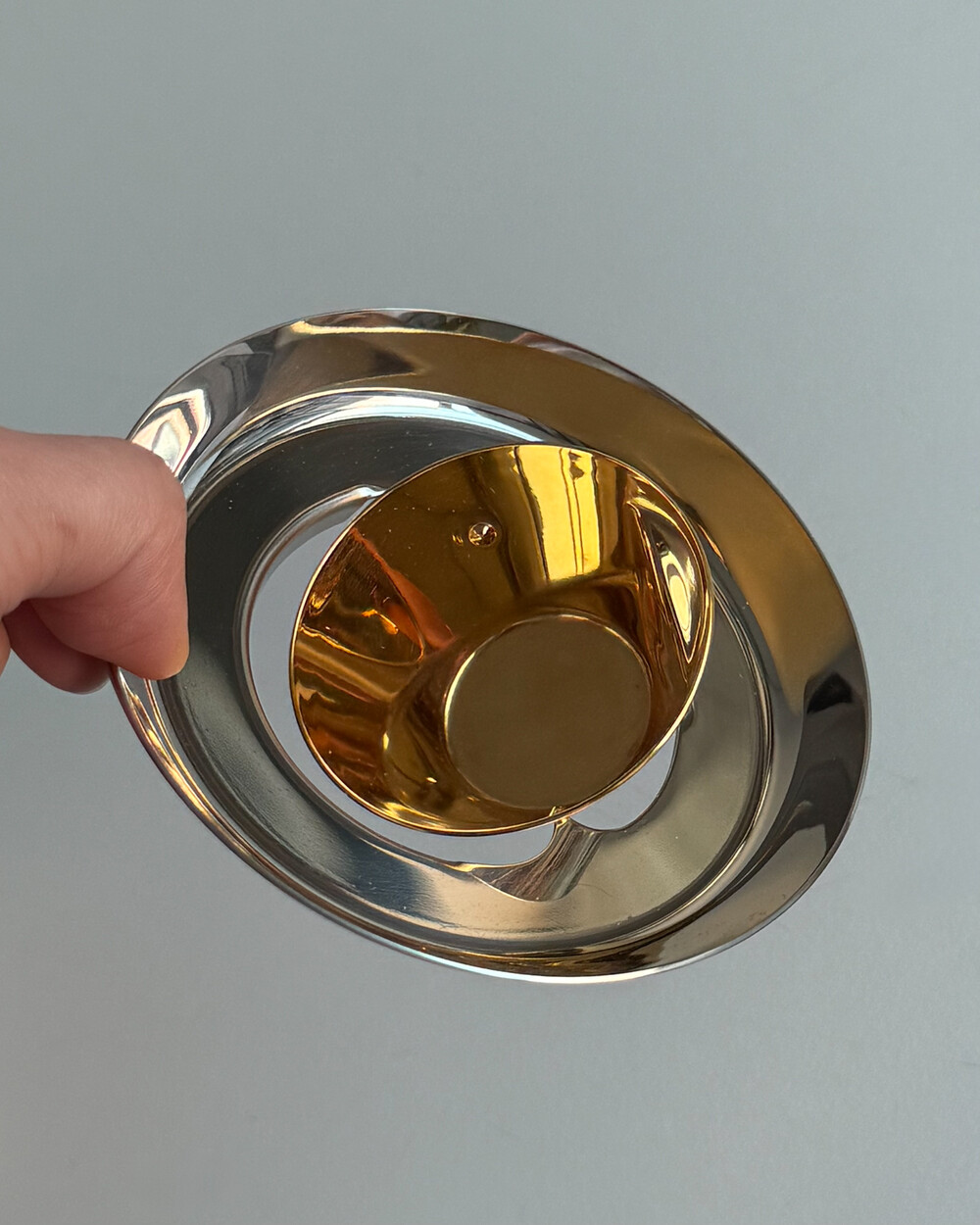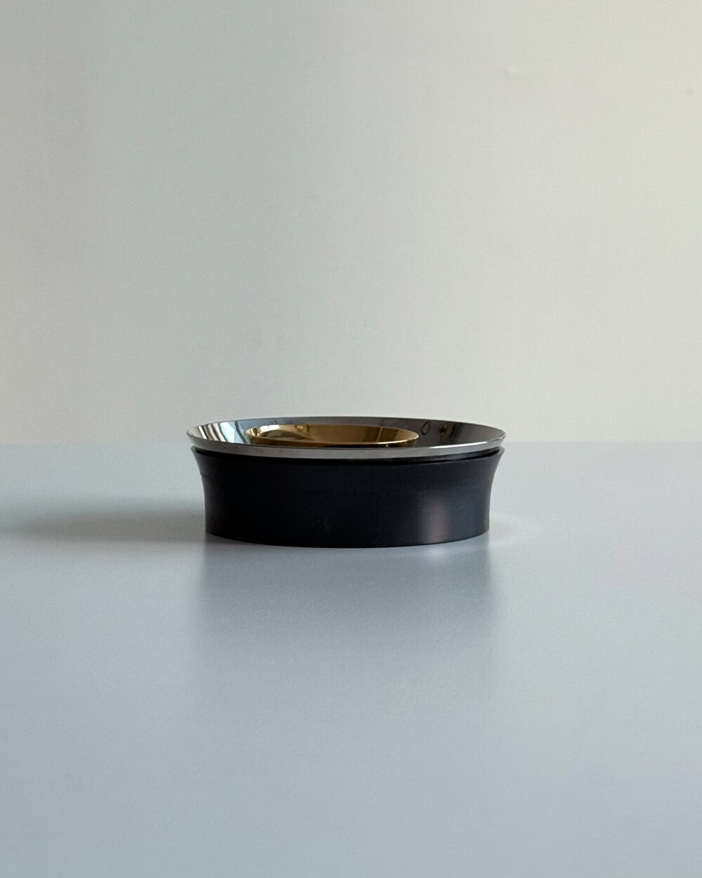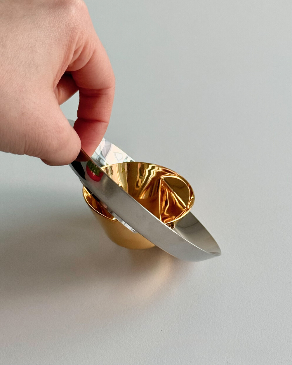 1970년대 독일 GRASOLI 사에서 생산된 위스키 및 칵테일 계량 바웨어입니다. 잔 위에 올려 사용하는 구조로, 가운데 계량컵에 술을 따르면 정해진 양이 차는 순간 컵이 기울며 자동으로 잔에 따라집니다. 별도의 계량 없이도 일정한 용량을 손쉽게 맞출 수 있습니다. 스테인리스 바디와 골드 톤의 계량컵이 대비를 이루는 깔끔한 디자인입니다.