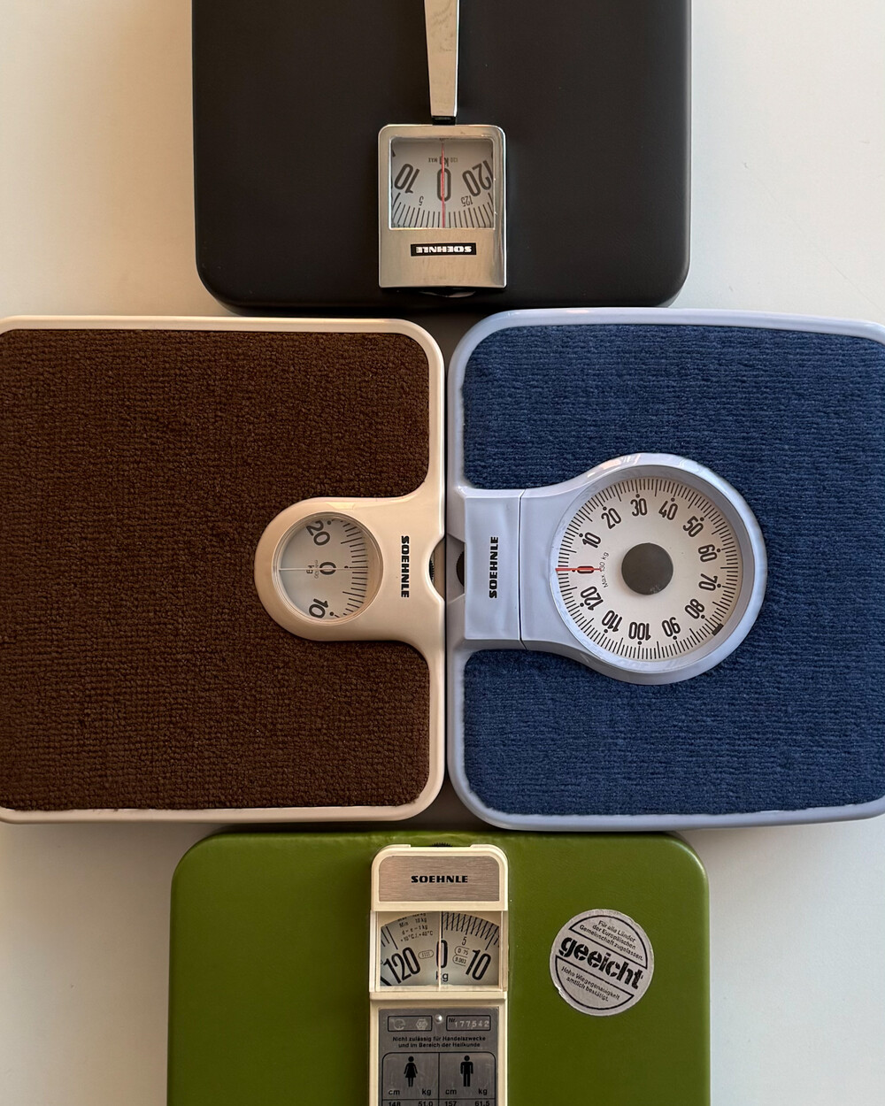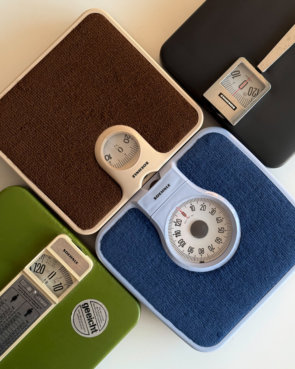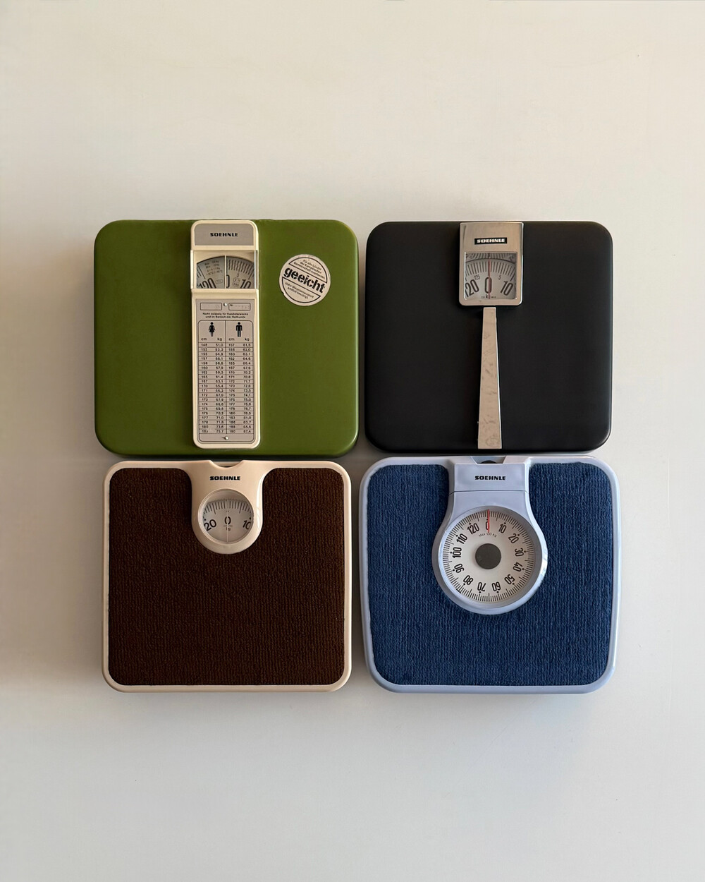 1970-80년대 생산되었던 SOEHNLE사의 빈티지 체중계입니다. 4가지 서로 다른 디자인의 모델로 매우 우수한 컨디션으로 입고되었습니다. 실사용은 물론, 공간에 레트로한 분위기를 더해주는 디자인 오브제로도 매력적인 아이템입니다.
