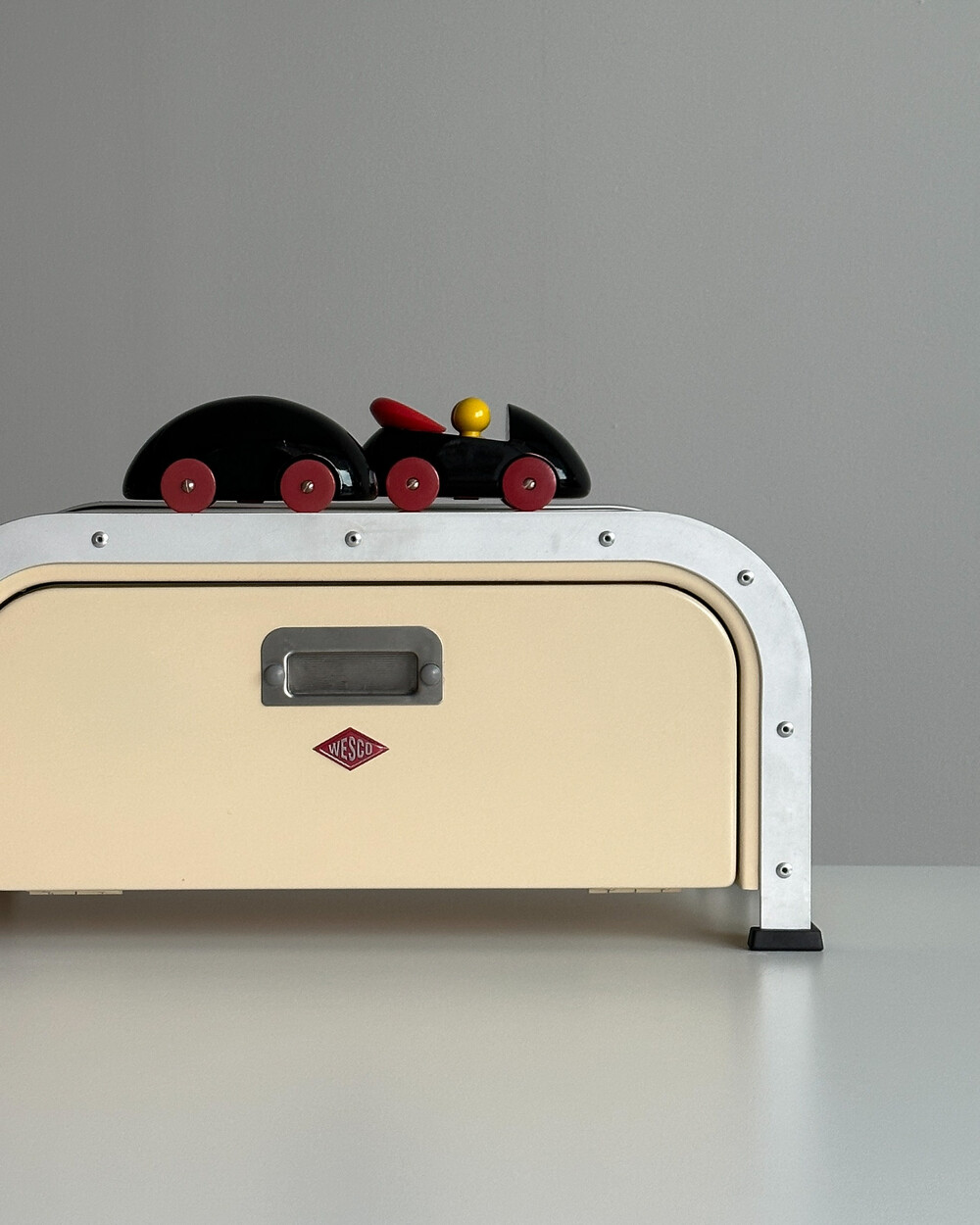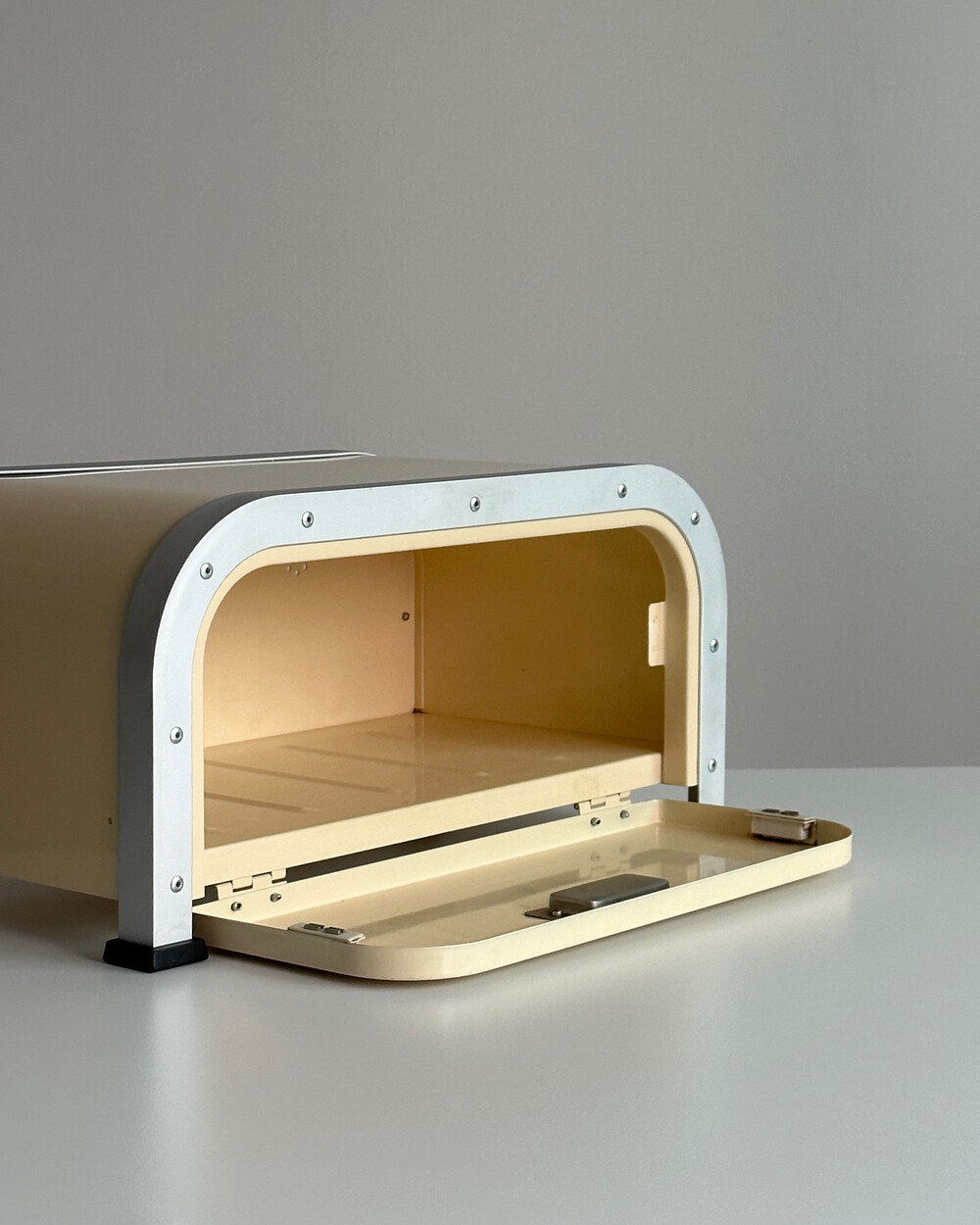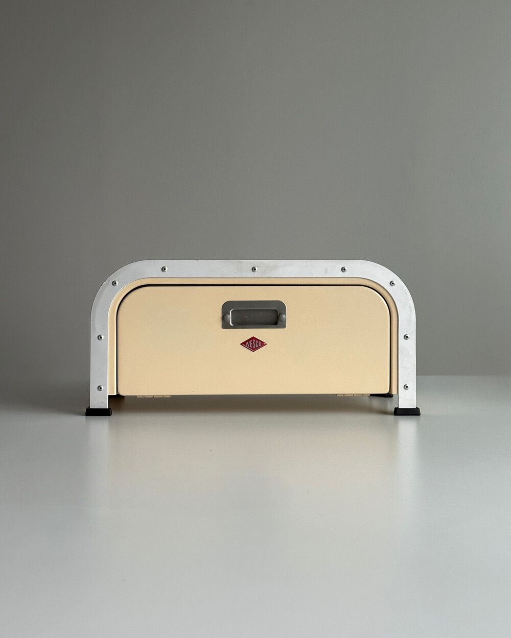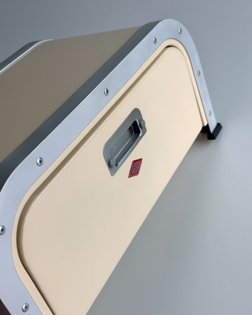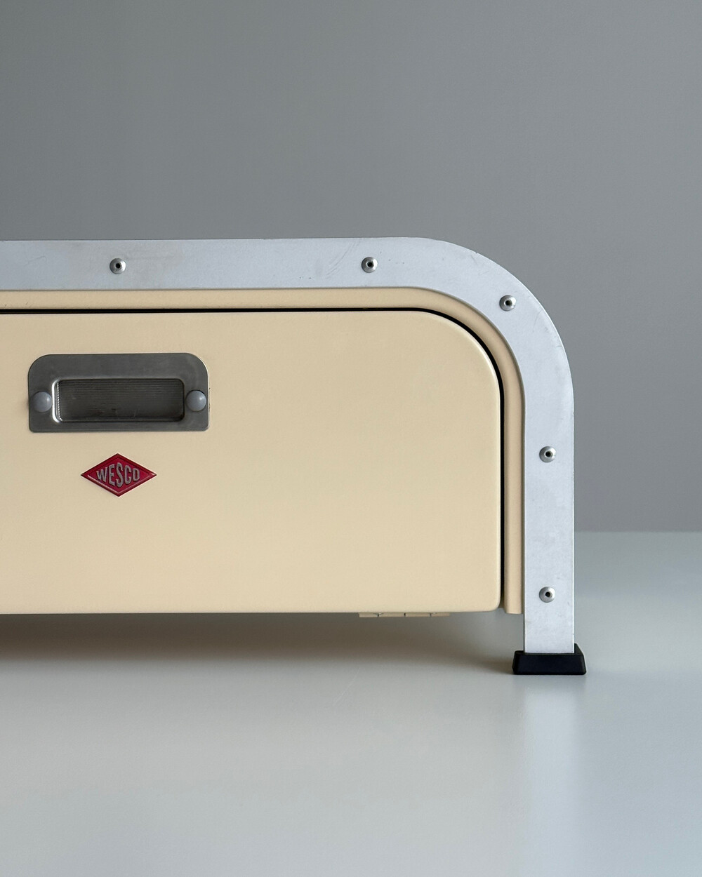 WESCO사의 빈티지 브레드 박스입니다. 해당 제품은 1950~60년대 WESCO의 오리지널 디자인을 기반으로 2000년대 초반에 한정 소량 생산된 모델로, 현재는 단종되어 더욱 높은 희소가치를 지니고 있습니다. 곡선 중심의 현대 WESCO 제품과 달리, 전면 개폐 도어와 알루미늄 프레임, 양측 통풍구로 구성된 기능 중심의 설계가 특징입니다.