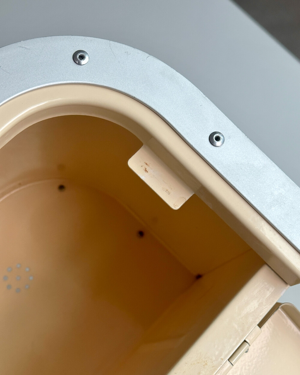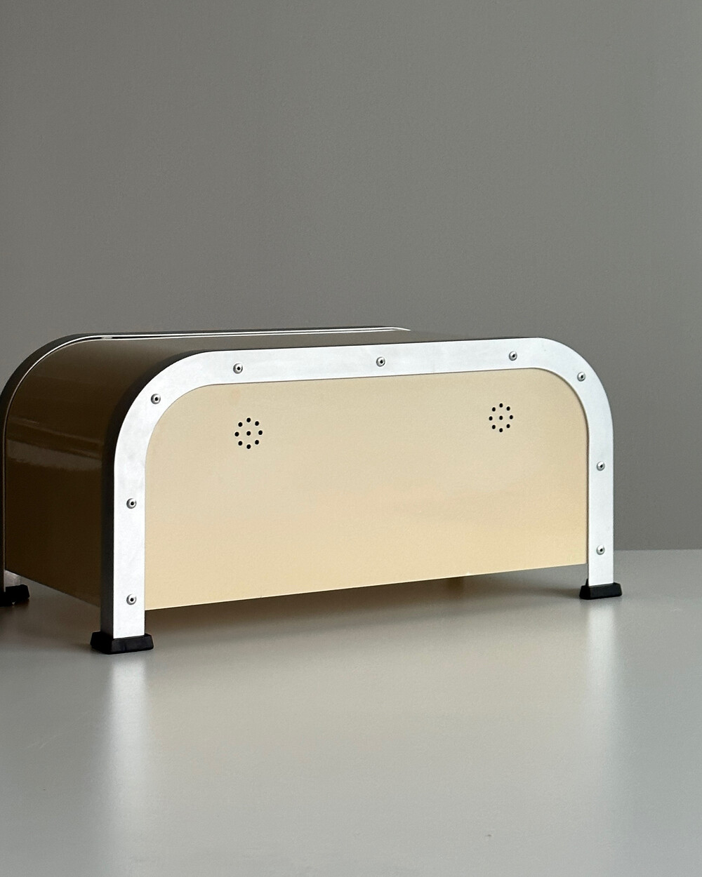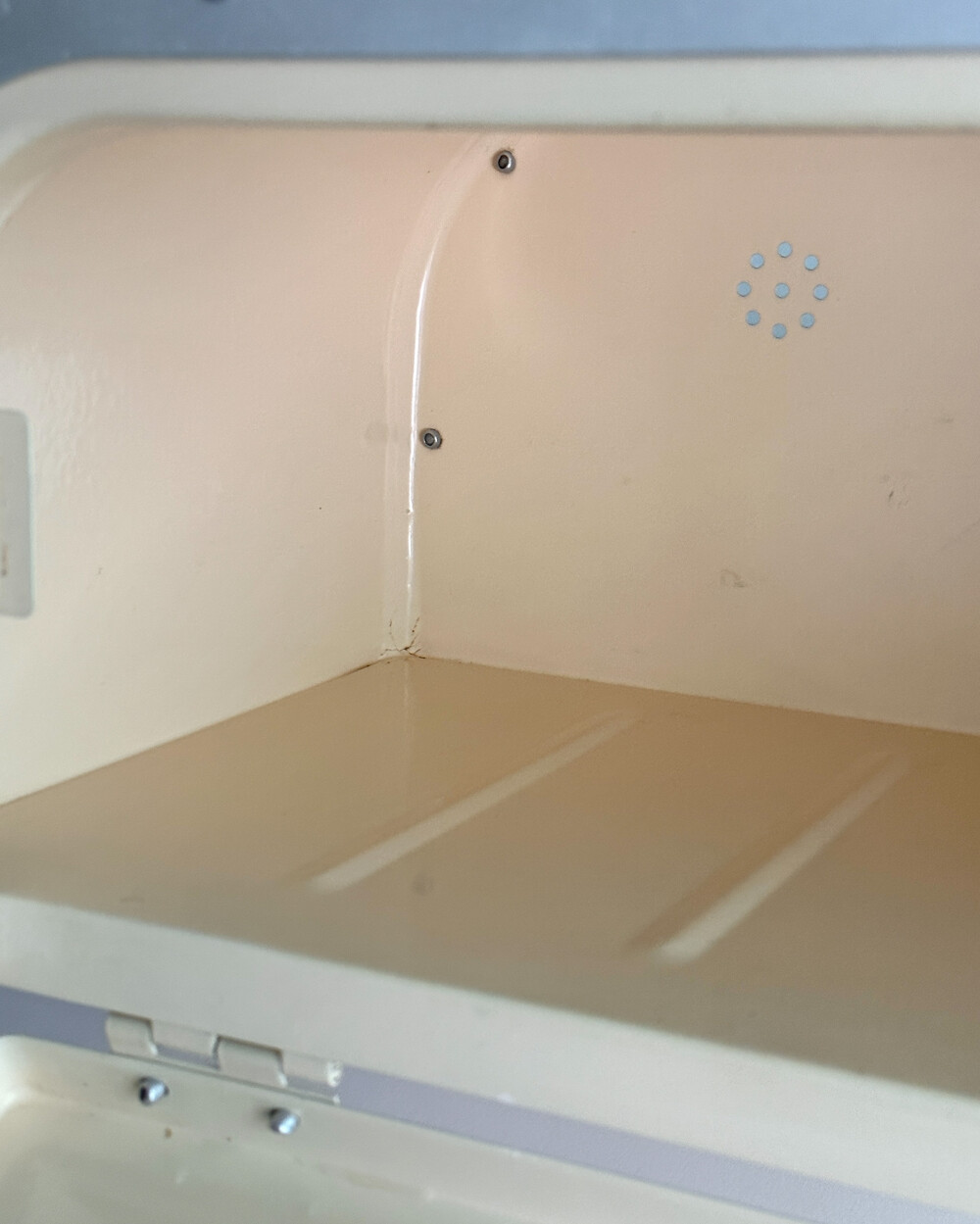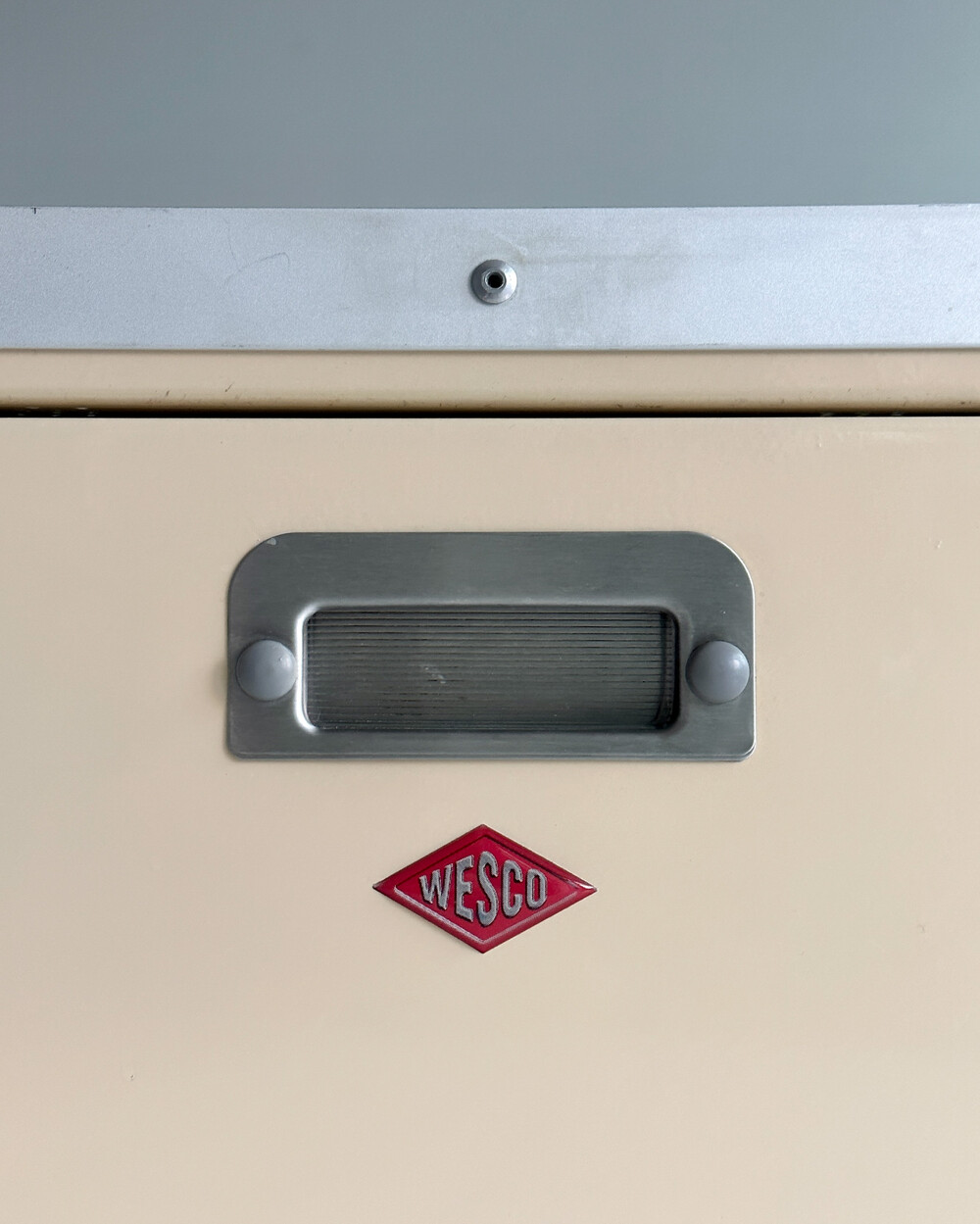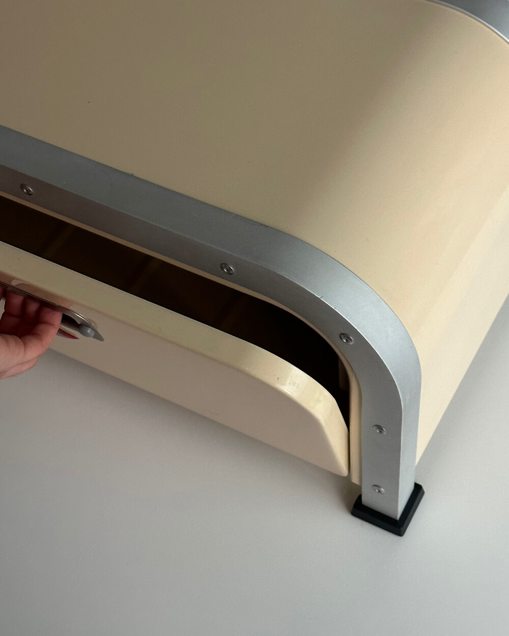 WESCO사의 빈티지 브레드 박스입니다. 해당 제품은 1950~60년대 WESCO의 오리지널 디자인을 기반으로 2000년대 초반에 한정 소량 생산된 모델로, 현재는 단종되어 더욱 높은 희소가치를 지니고 있습니다. 곡선 중심의 현대 WESCO 제품과 달리, 전면 개폐 도어와 알루미늄 프레임, 양측 통풍구로 구성된 기능 중심의 설계가 특징입니다.