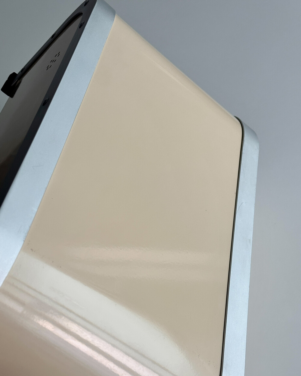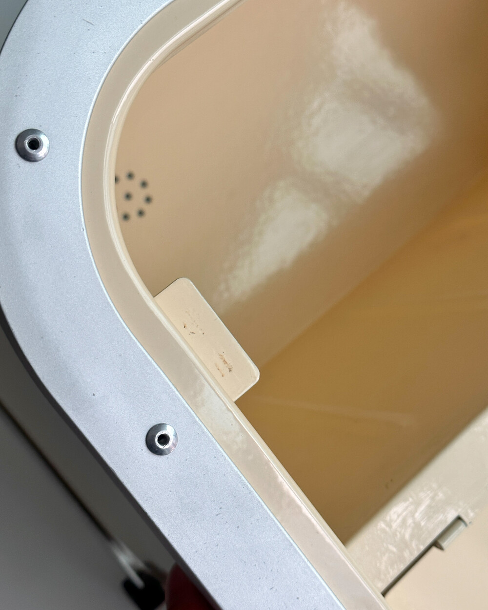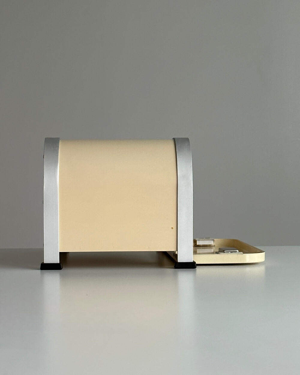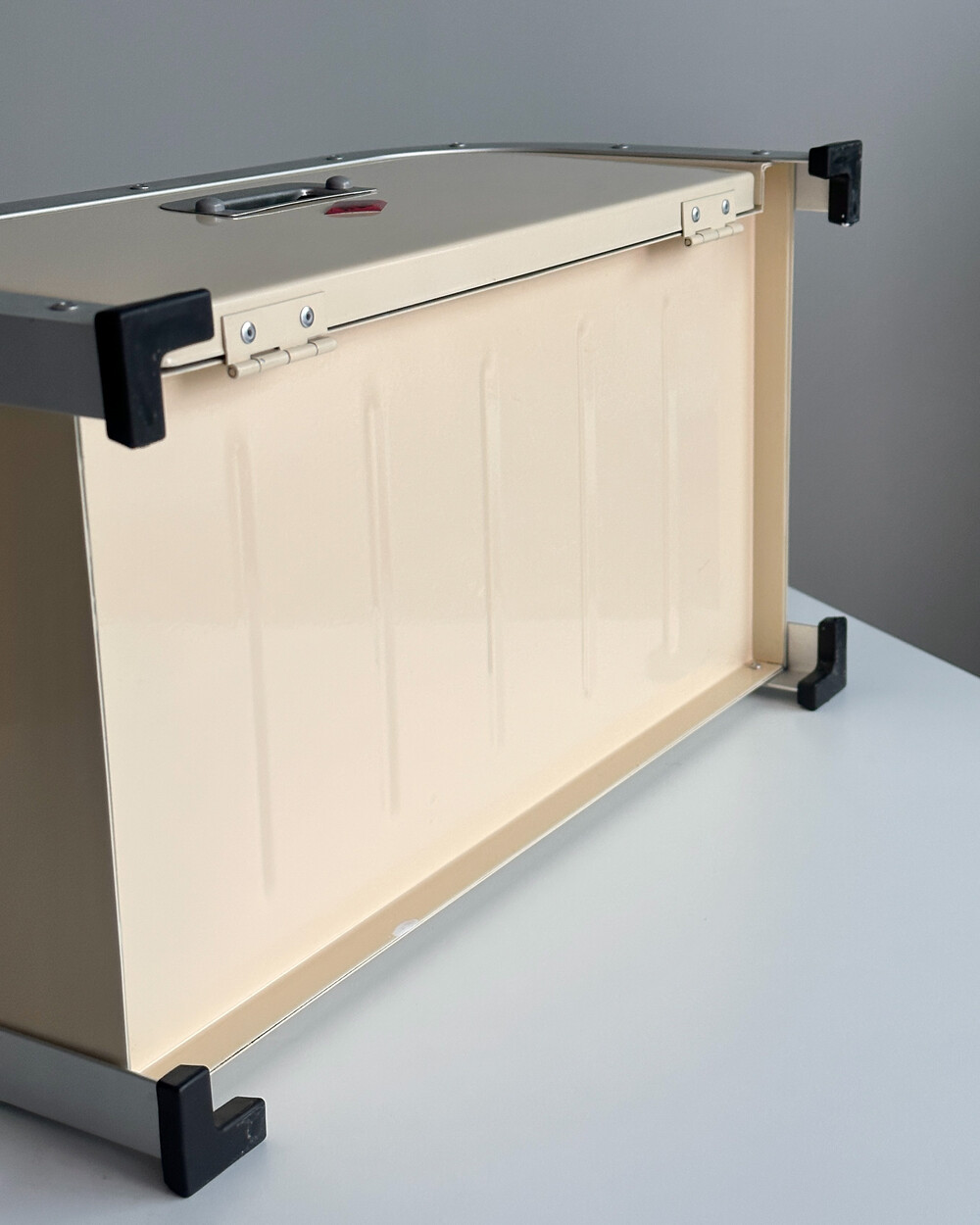 WESCO사의 빈티지 브레드 박스입니다. 해당 제품은 1950~60년대 WESCO의 오리지널 디자인을 기반으로 2000년대 초반에 한정 소량 생산된 모델로, 현재는 단종되어 더욱 높은 희소가치를 지니고 있습니다. 곡선 중심의 현대 WESCO 제품과 달리, 전면 개폐 도어와 알루미늄 프레임, 양측 통풍구로 구성된 기능 중심의 설계가 특징입니다.