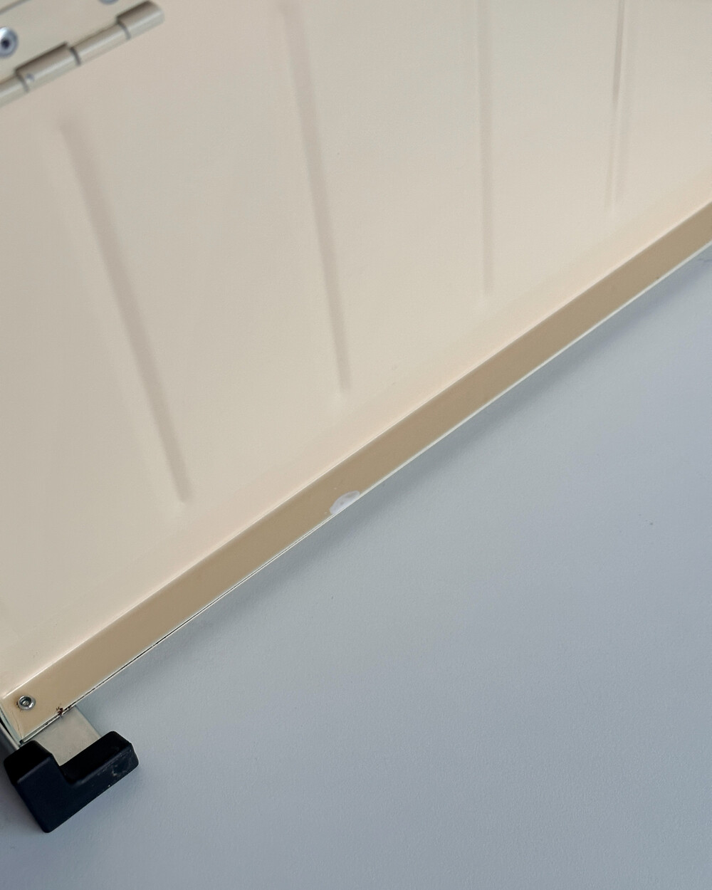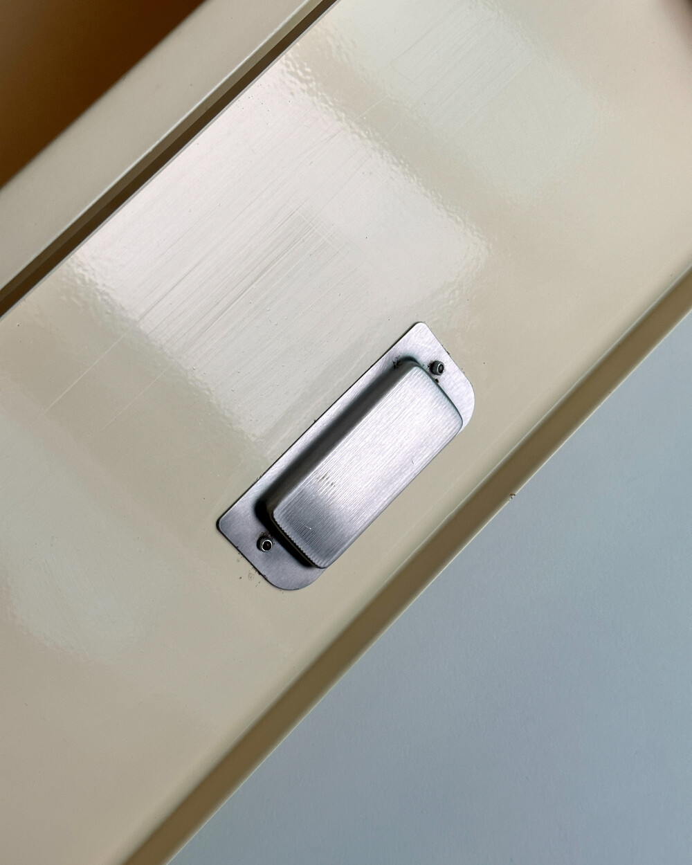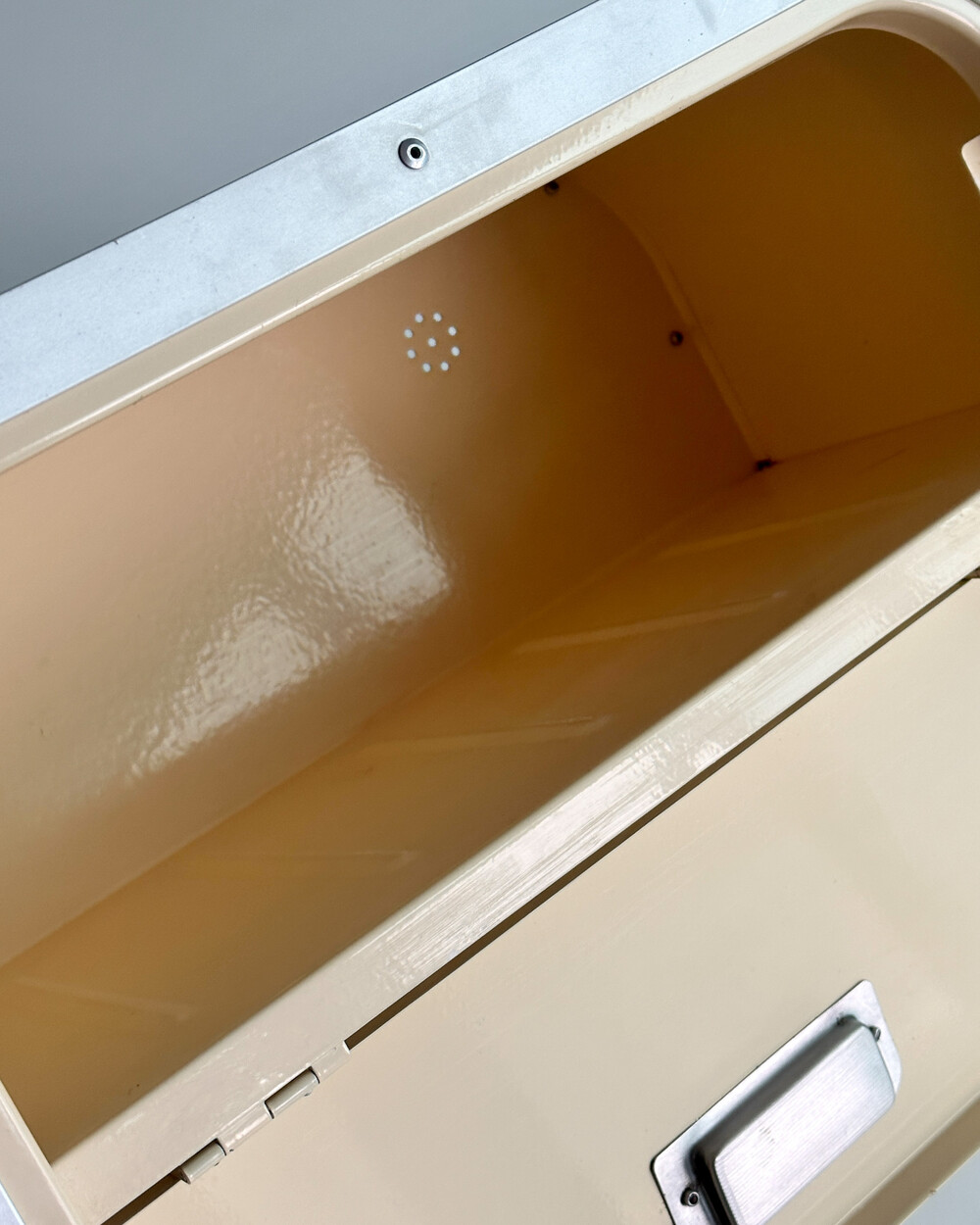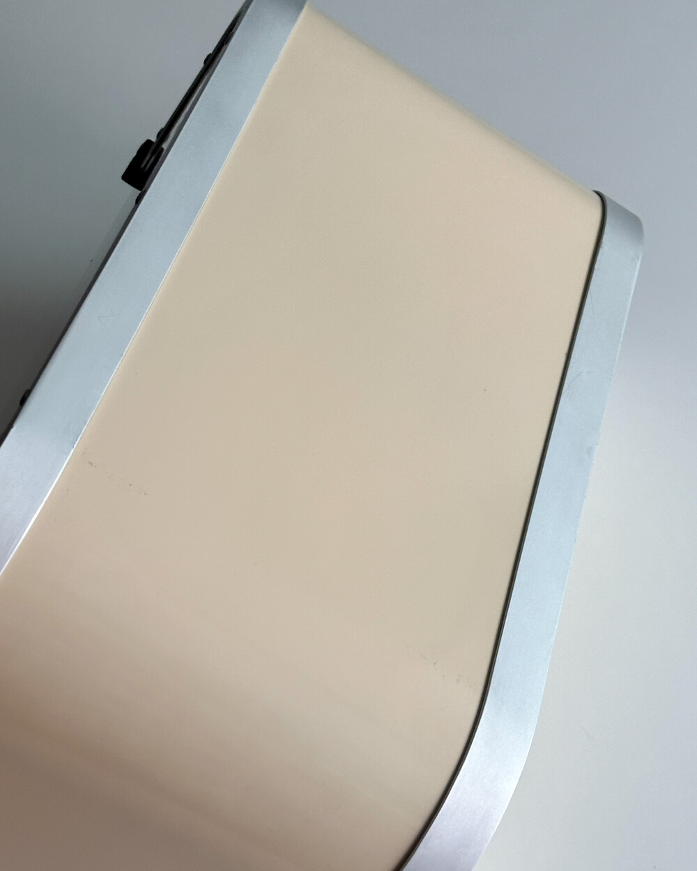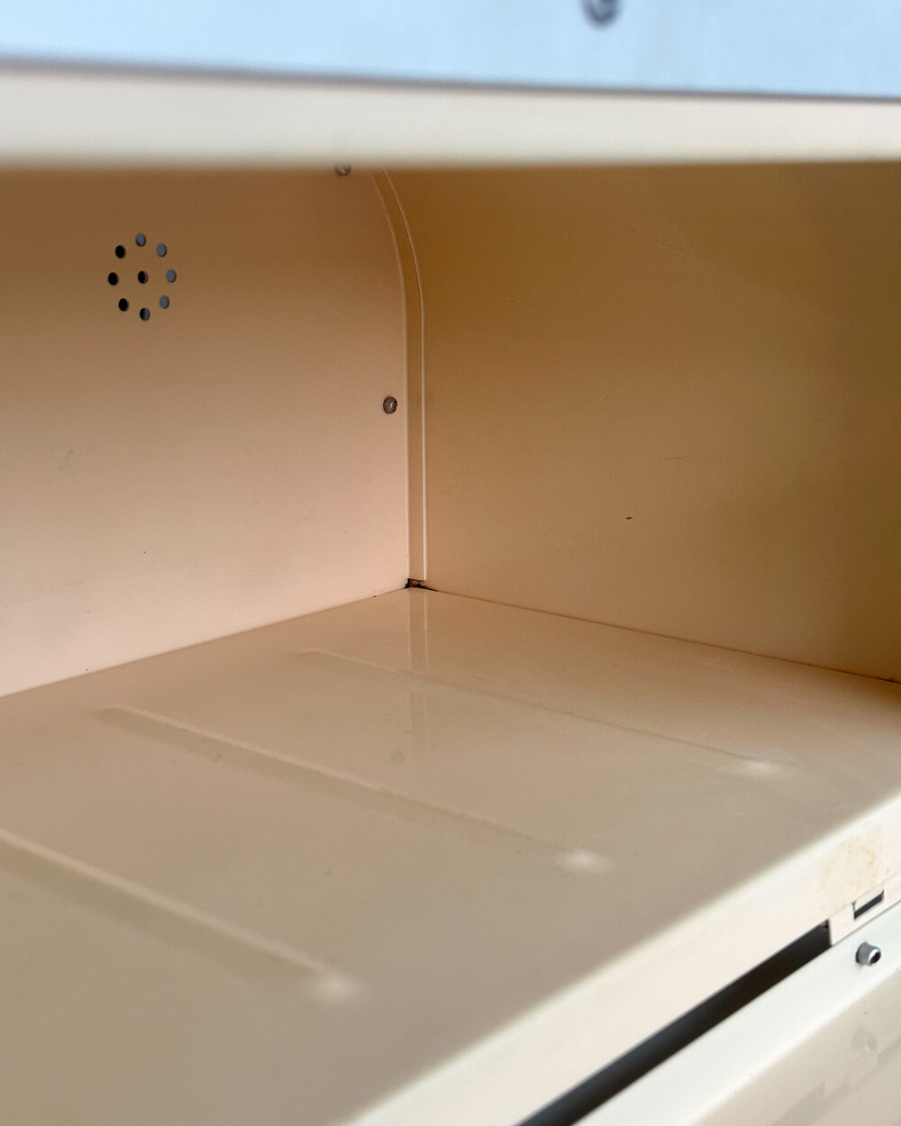 WESCO사의 빈티지 브레드 박스입니다. 해당 제품은 1950~60년대 WESCO의 오리지널 디자인을 기반으로 2000년대 초반에 한정 소량 생산된 모델로, 현재는 단종되어 더욱 높은 희소가치를 지니고 있습니다. 곡선 중심의 현대 WESCO 제품과 달리, 전면 개폐 도어와 알루미늄 프레임, 양측 통풍구로 구성된 기능 중심의 설계가 특징입니다.