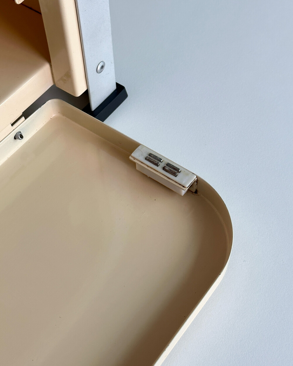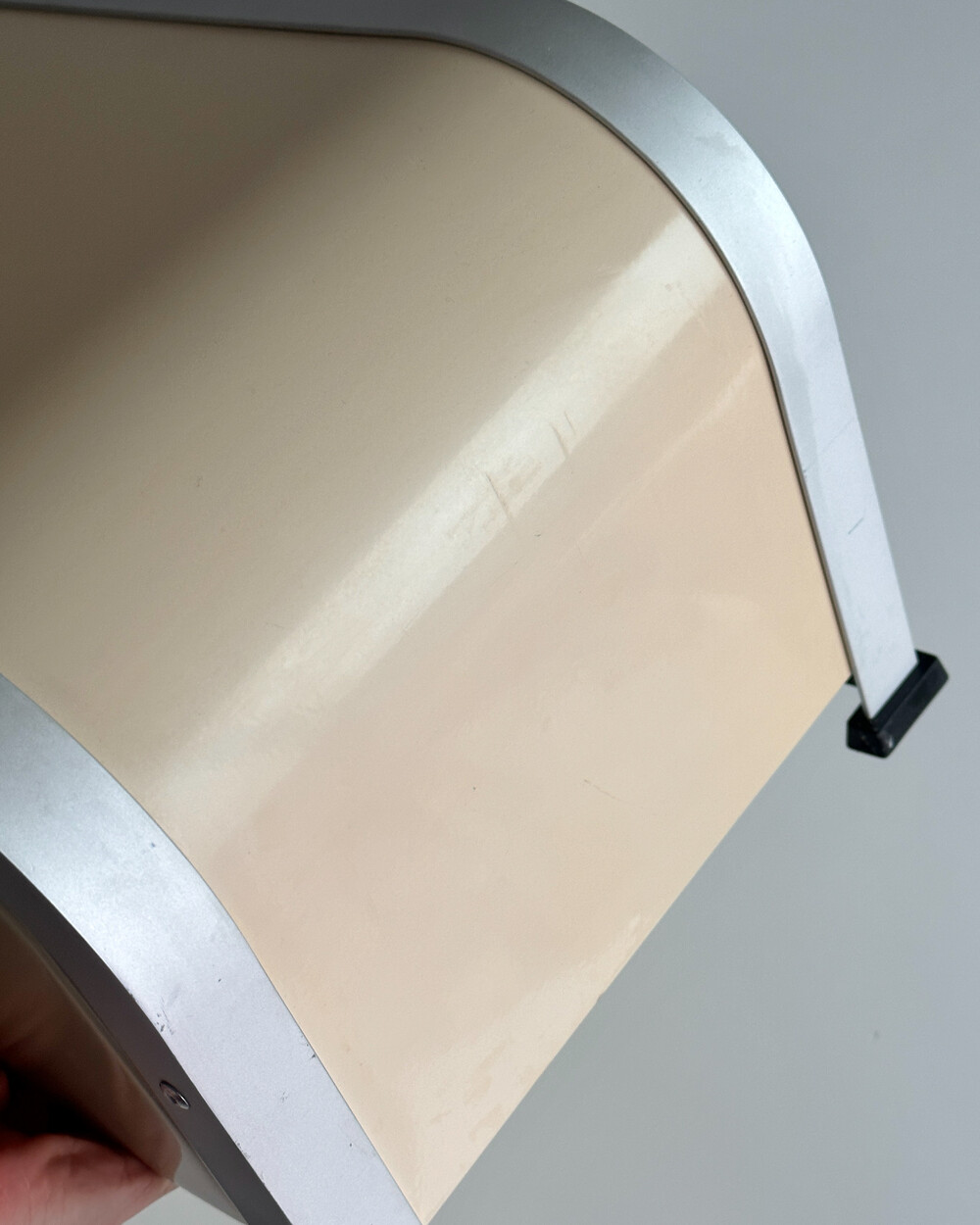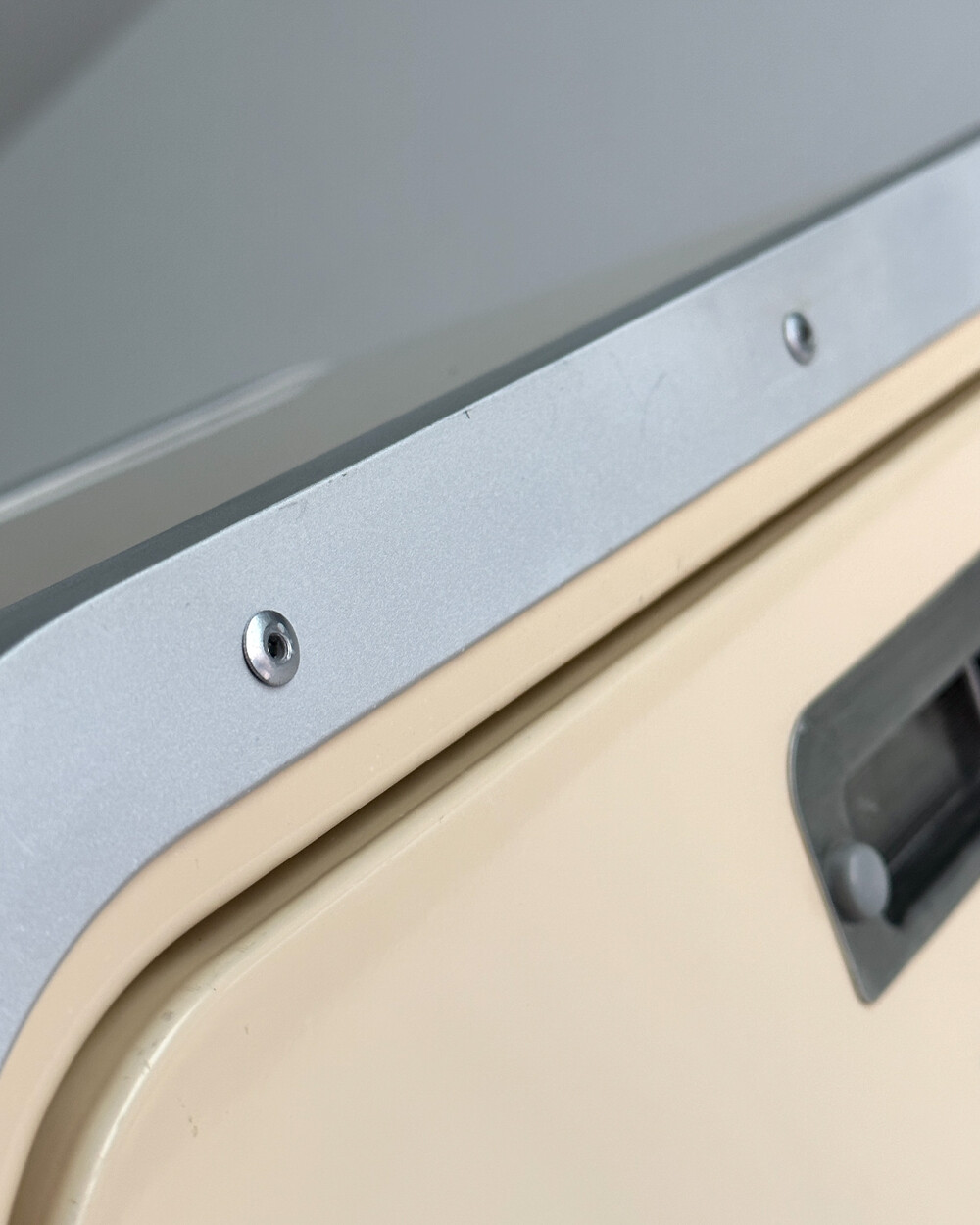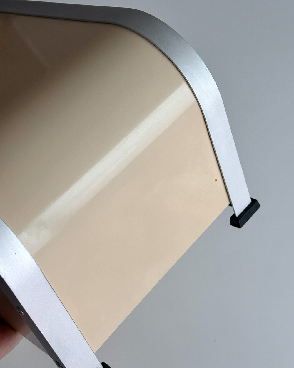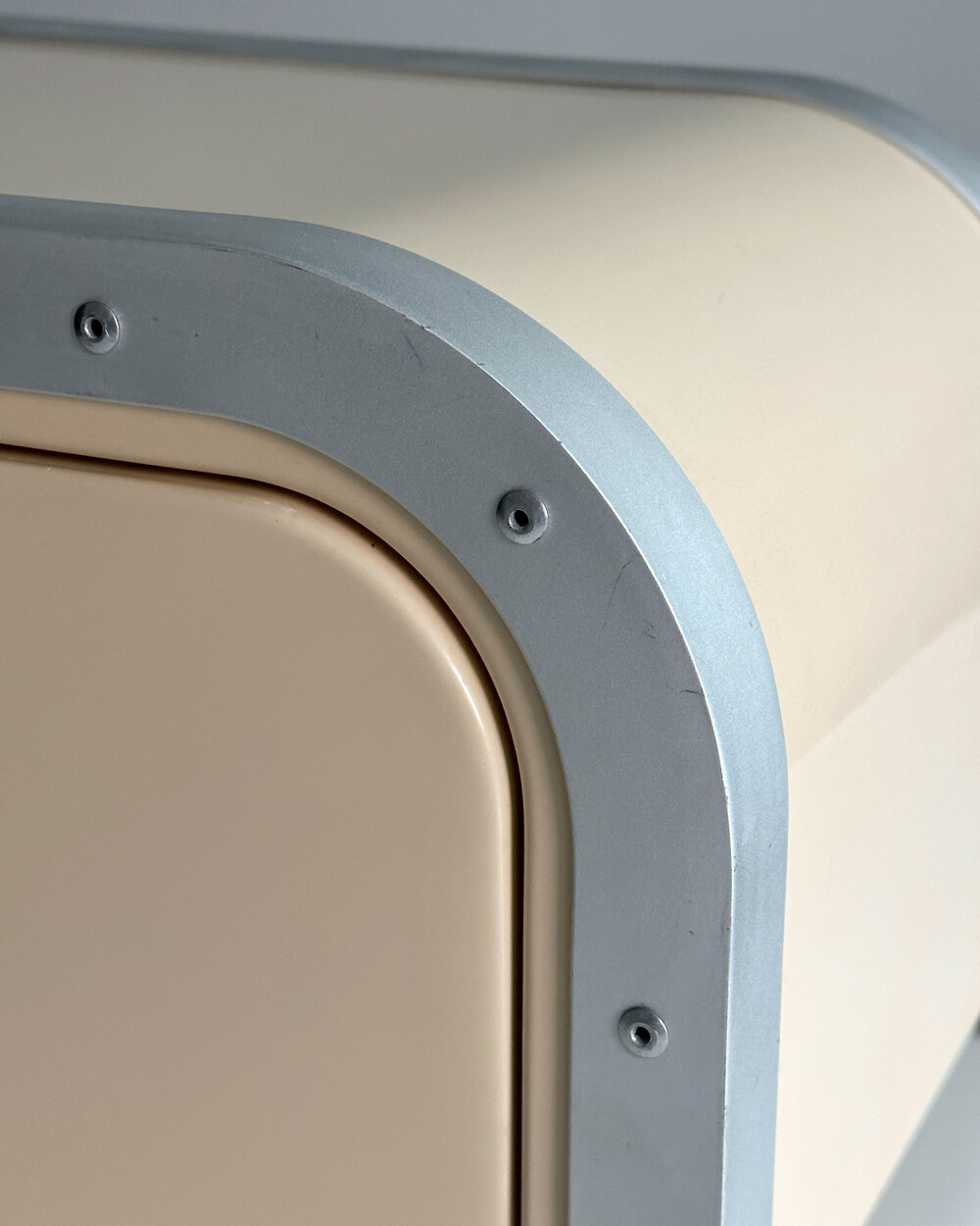 WESCO사의 빈티지 브레드 박스입니다. 해당 제품은 1950~60년대 WESCO의 오리지널 디자인을 기반으로 2000년대 초반에 한정 소량 생산된 모델로, 현재는 단종되어 더욱 높은 희소가치를 지니고 있습니다. 곡선 중심의 현대 WESCO 제품과 달리, 전면 개폐 도어와 알루미늄 프레임, 양측 통풍구로 구성된 기능 중심의 설계가 특징입니다.